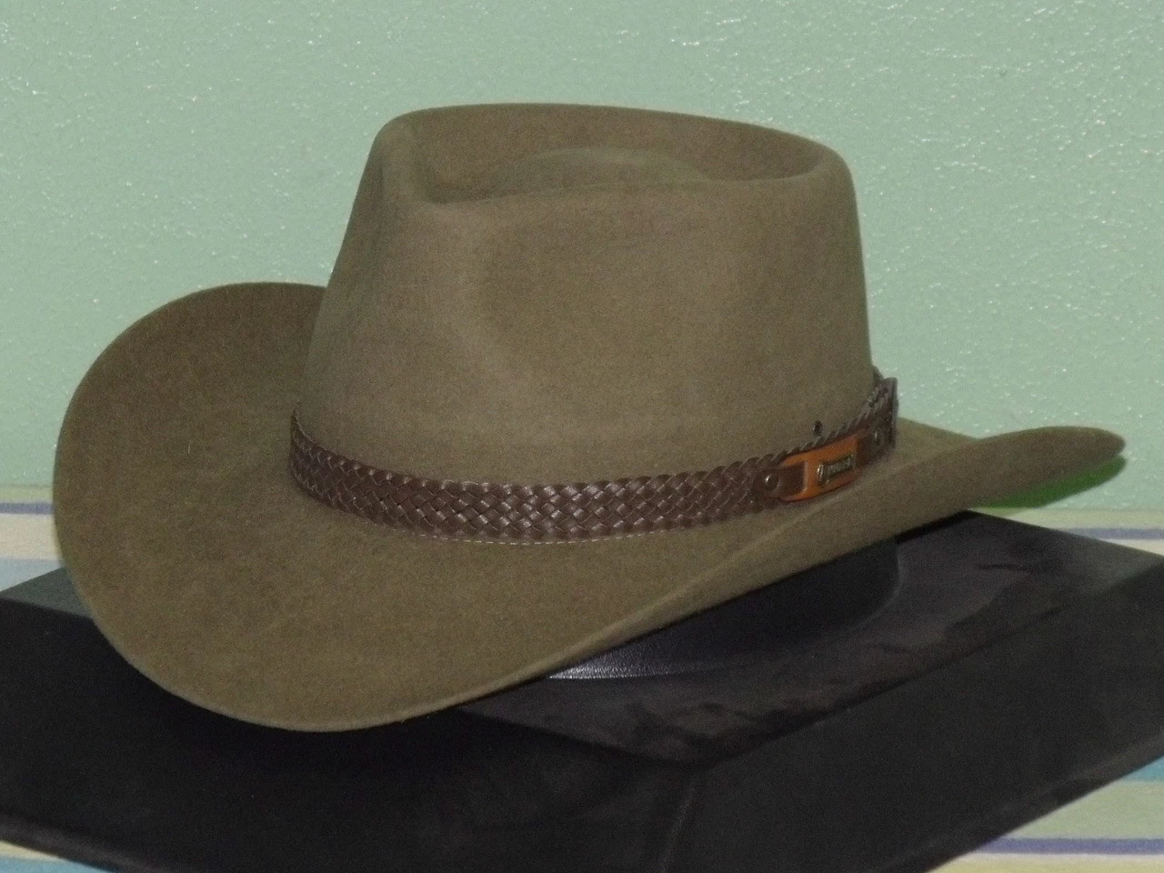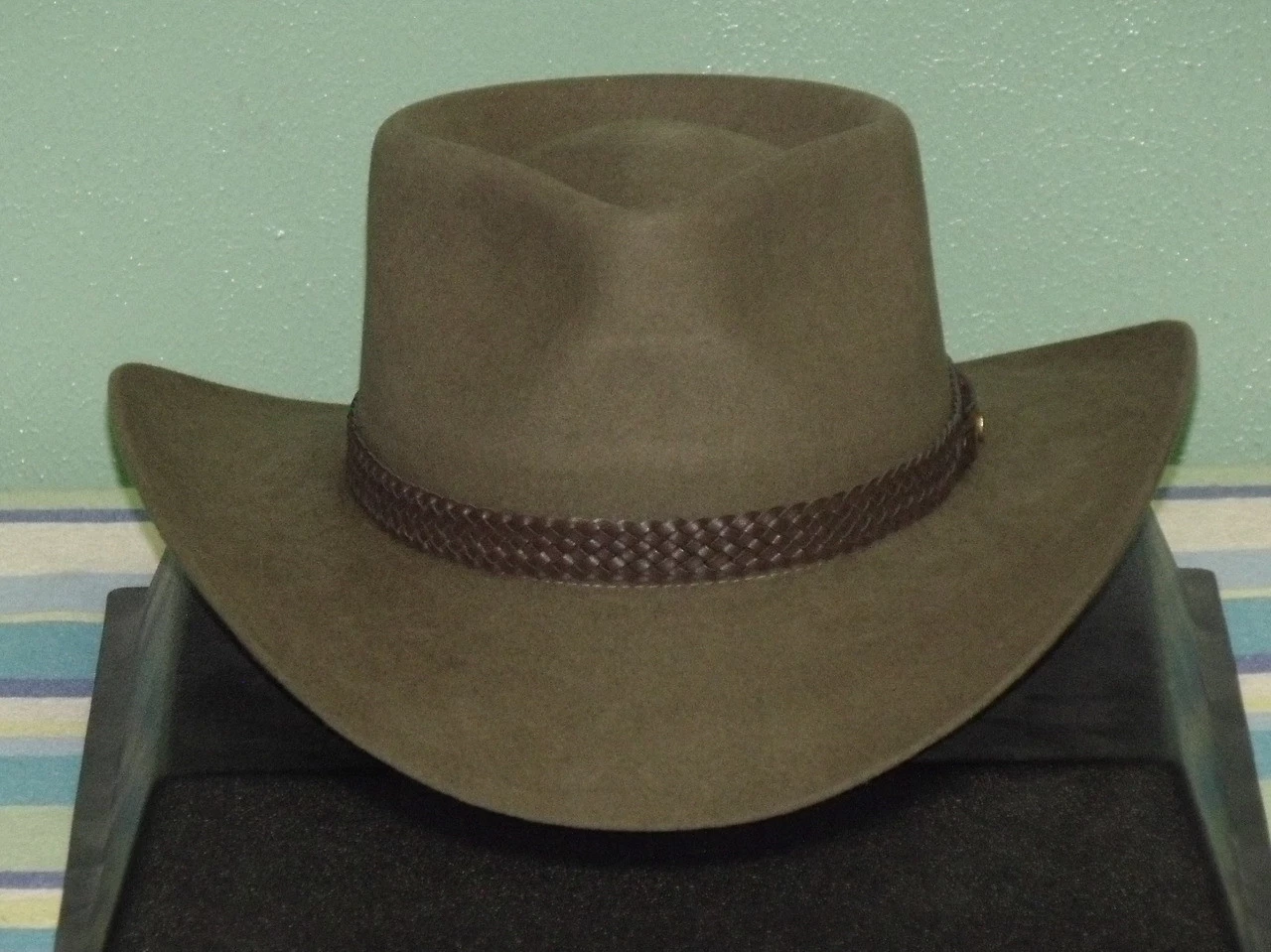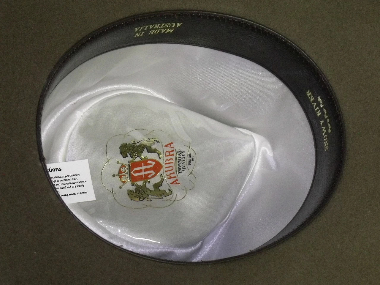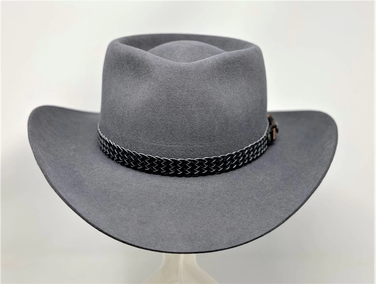 The Snowy River is a pre-creased stockman’s hat from Akubra, a classic Australian outback hat. It has a pinched telescope crown and a brim with rolled sides with front and back turned down. This enduring outback style may be worn over the eyes or well back on the head in typical Australian fashion. The crown is 4 inches high. The brim is 3¼ inches wide, with a raw edge. The pure fur felt is Akubras Imperial Quality. The hat is fully lined and has a bonded leather ornamental band and a reeded roan leather sweatband. UPF rating 50+.