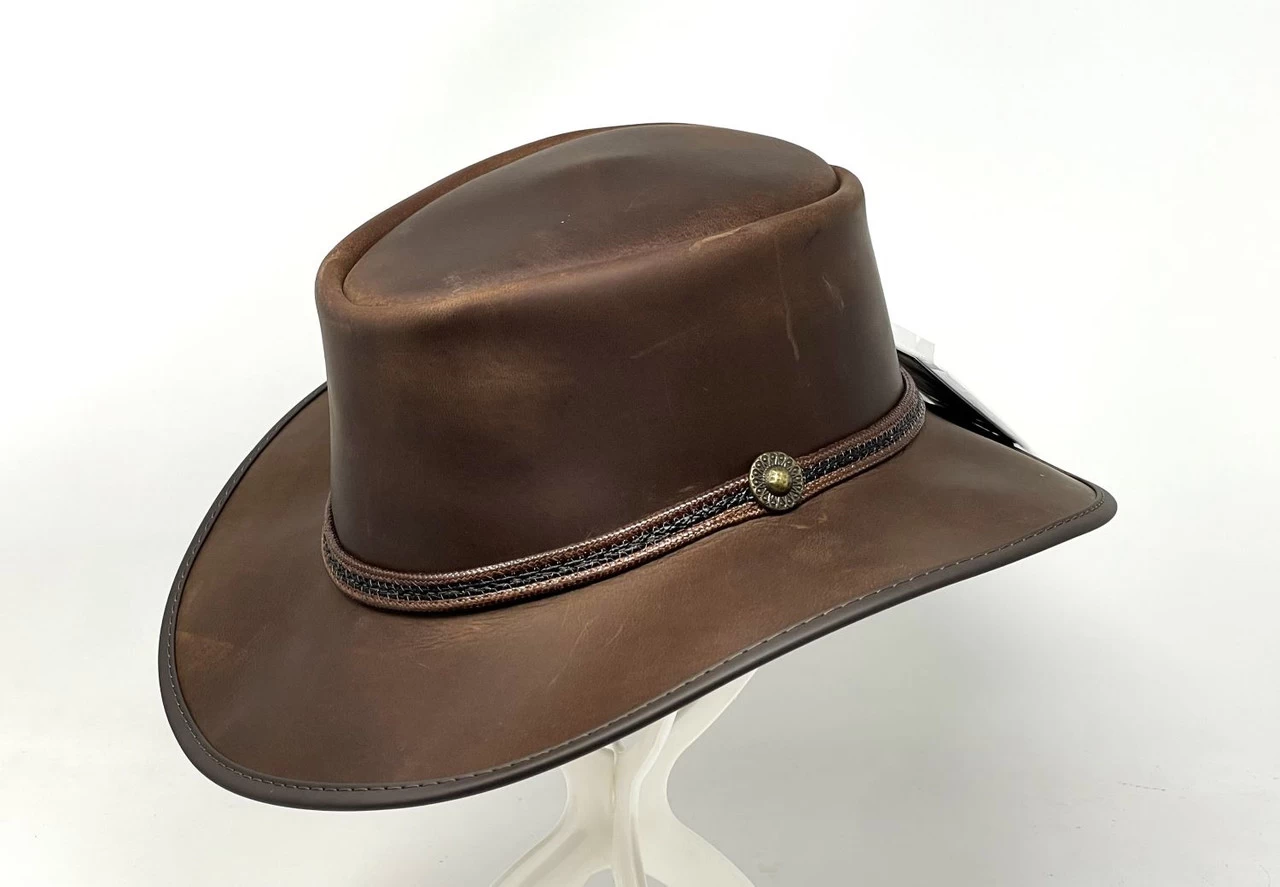 Handcrafted in the USA of top grain cowhide leather the durable Midnight Rider adventurer hat is soft and flexible enough to handle crushing and abuse while maintaining its custom shape. Ideal for men and women it has a 2 3/4″ brim and 3 3/4″ crown. Features include a removable/replaceable/washable sweat liner.