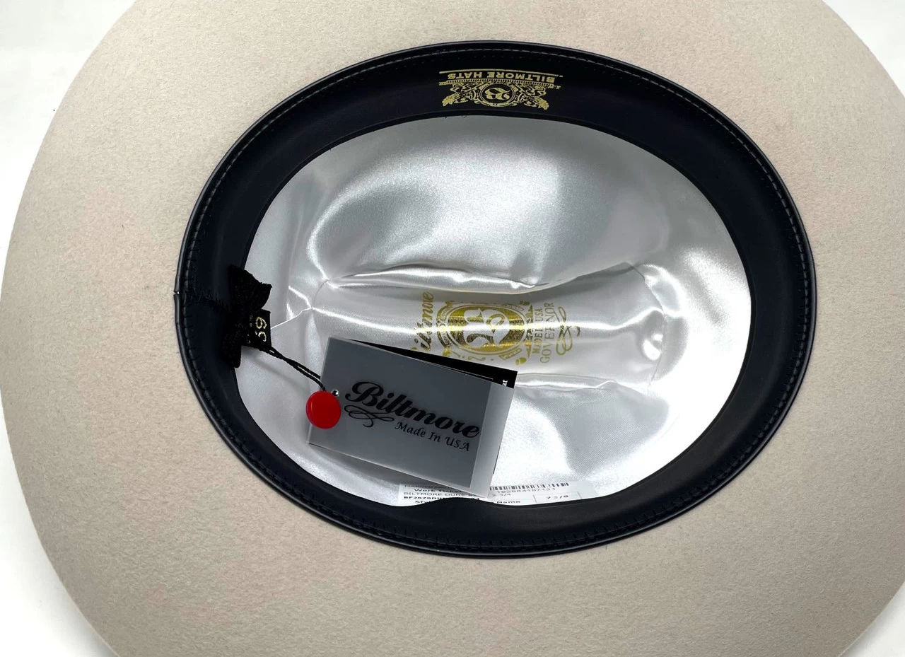 Biltmore’s Silver Belly (light tan) Dune is a classic cattleman style hat made in the USA. It is constructed of a fine durable and water repellent merino wool and has a somewhat soft body. The crown is a 4 1/4 cattleman style and the raw edge brim is 2 3/4″. Features include horsehair band, Biltmore pin, supple leather sweatband and full satin lining.