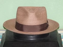 The Slicker 3 is a tan handwoven Shantung straw fedora from Biltmore’s Vintage Couture Collection. Made in the USA it has a 3″ brim and a teardrop crown measuring approximately 4 1/4″ at the front crease and 3 3/4″ at the back. Features include a wide grosgrain ribbon with a narrow leather overlay and wing tip bow, removable feather, Biltmore pin and a pig suede sweatband.