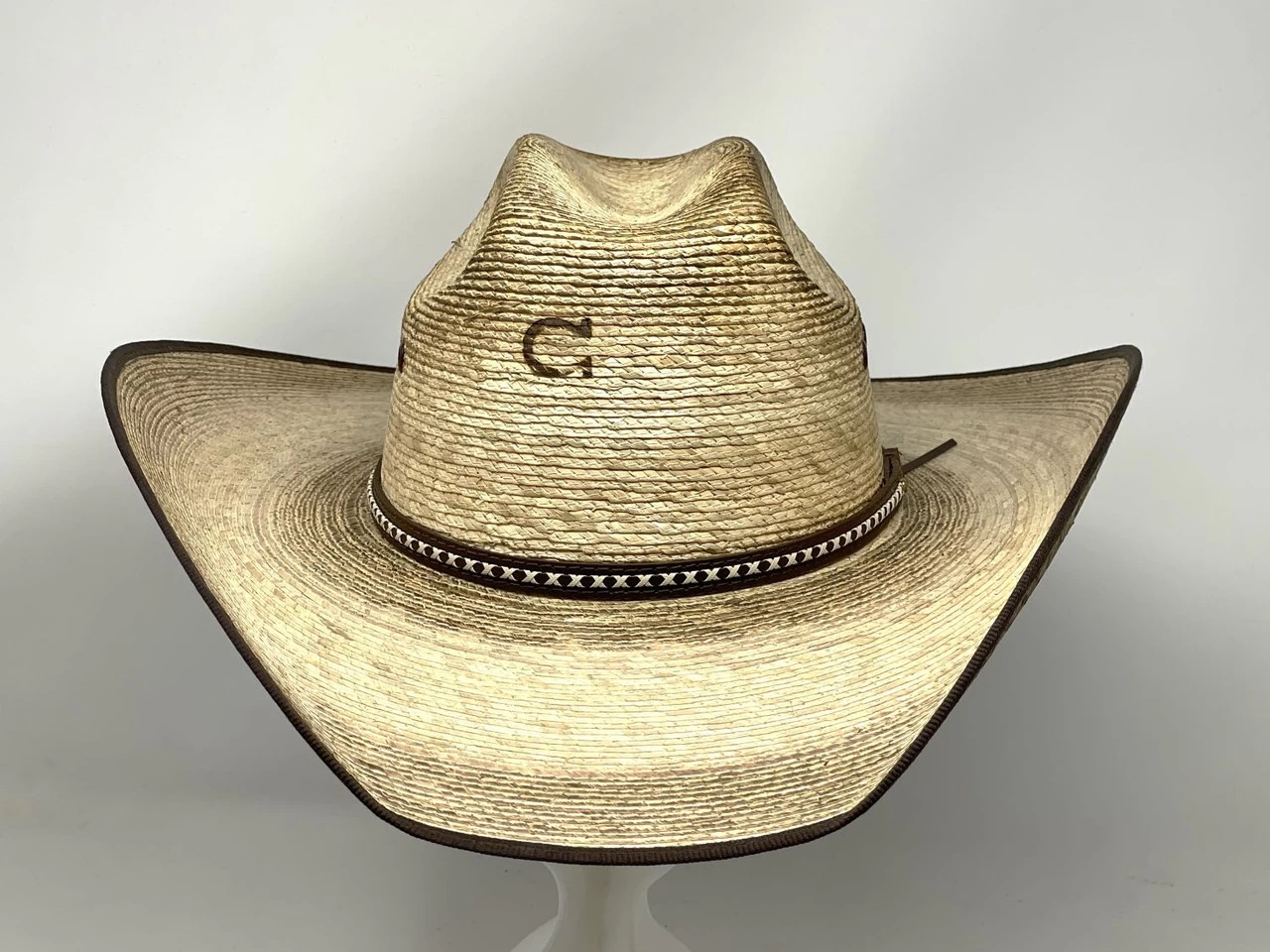 A great looking burned Mexican palm leaf hat by Charlie 1 Horse. The “Comanche” has a 4-1/2″ crown with eyelets, 4″ bound-edge brim and a faux leather sweatband.