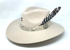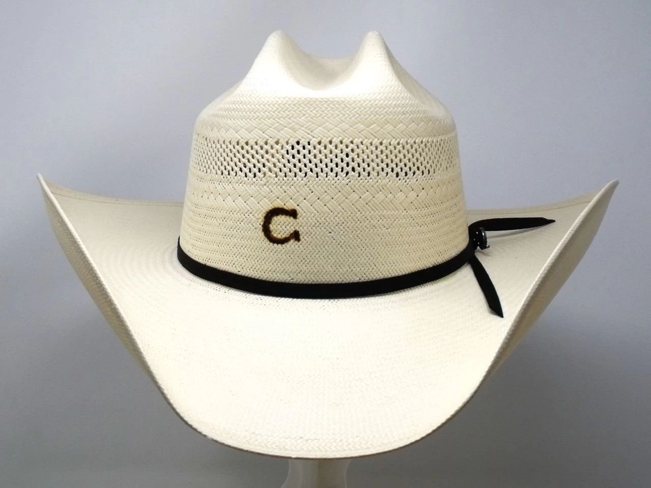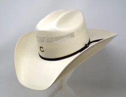 The Cool Hand is from the Charlie 1 Horse Back at the Ranch Collection. Made in the USA of 10X Shantung straw, it has a 4 1/8″ cattleman crown and a 4 1/4″ brim. Features include the horseshoe firebrand, all around ventilation, a doubled ribbon band with a Charlie 1 Horse pin, and a Dri-Lex sweatband.