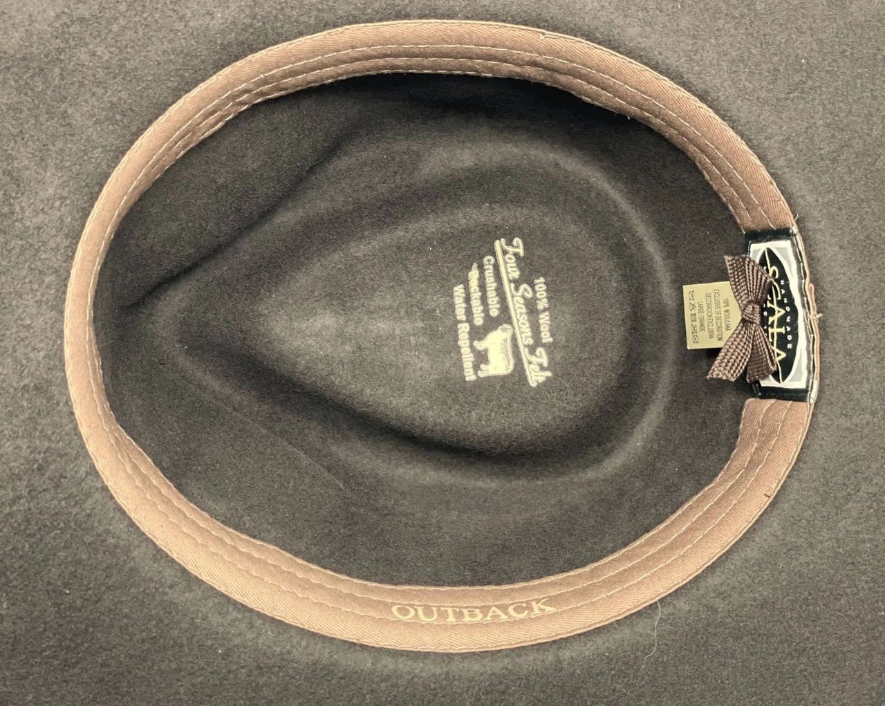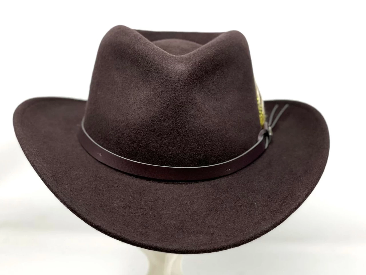Scala’s Dakota is inspired by the Australian Outback and is the perfect crossover hat. Constructed of quality wool felt it has a 4 1/4″ (at front crease) pinch front crown and a 3″ heavily dipped brim. It is Crushable, packable, water repellent and features a Scala side pin, faux leather band, removable feather and a comfortable cotton sweatband.