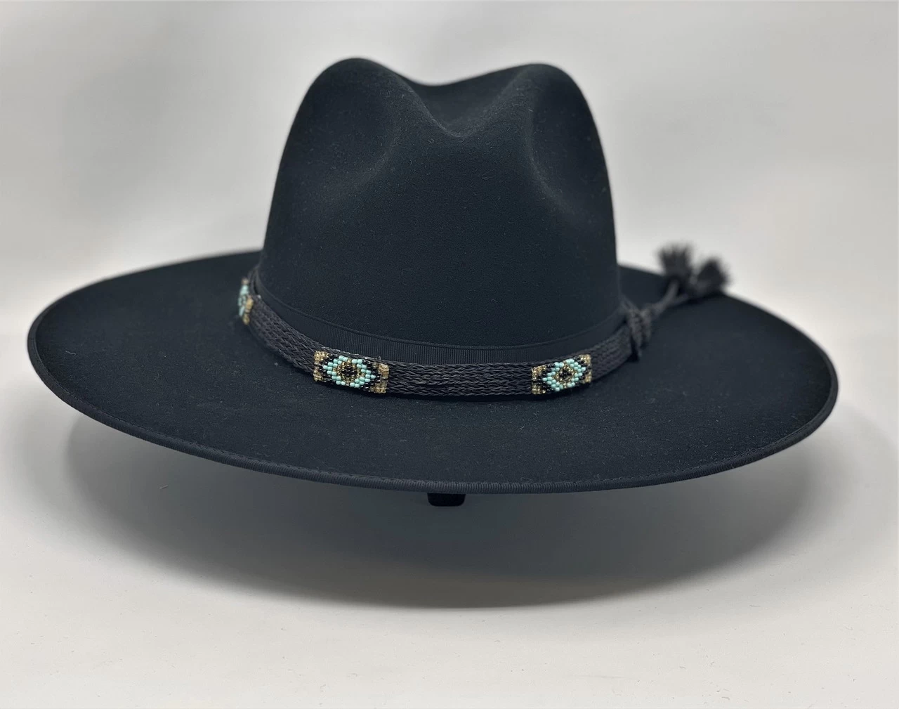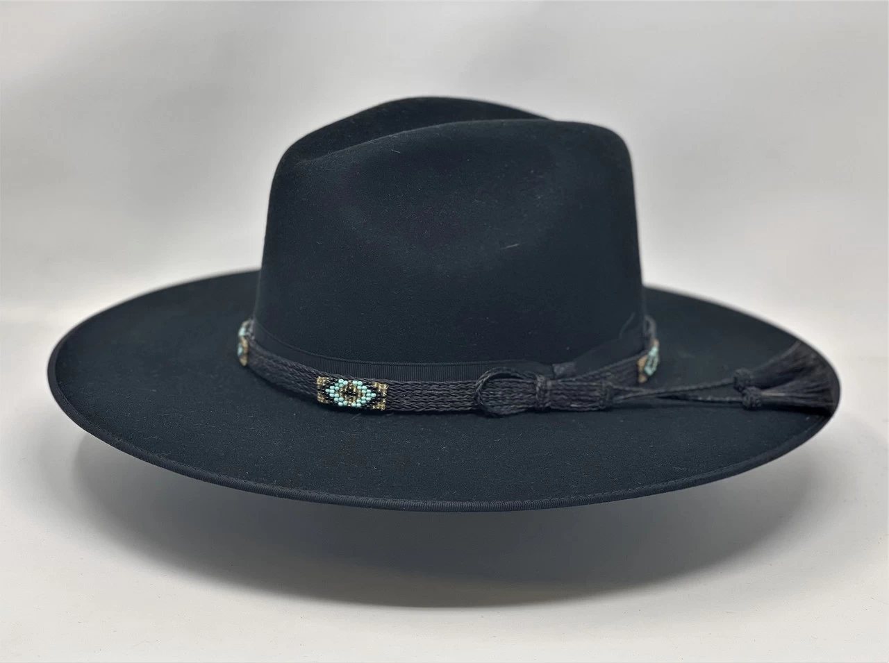 The Helix is another fine cross-over hat from Stetson’s Seeker Collection. Made in the USA of firm, black wool felt it has a 3 3/4″ bound edge brim and a 4 1/2″ pinch front crown (measurements approximate). Features include a bonded leather sweatband, hand woven horsehair band with beaded accents, and full satin lining.