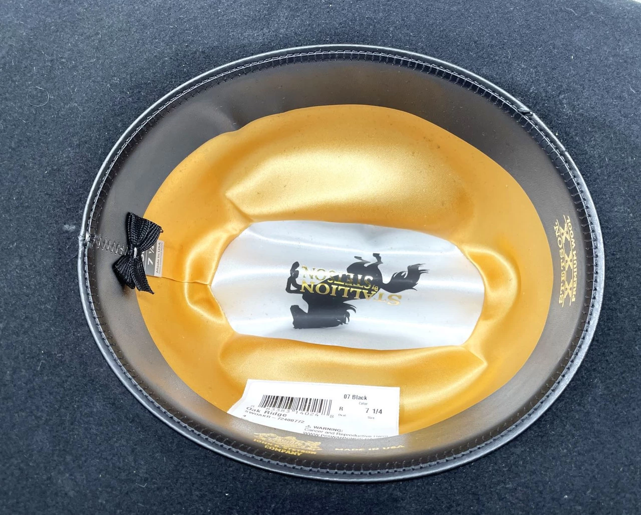 Made in the USA the Oak Ridge is from the Stallion Collection by Stetson. Available in black and chocolate it has a 4″ brim and a 4 1/4″ regular oval cattleman crown. Features include a self-matching band with a 3-piece buckle set, a bonded leather sweatband and full lining.