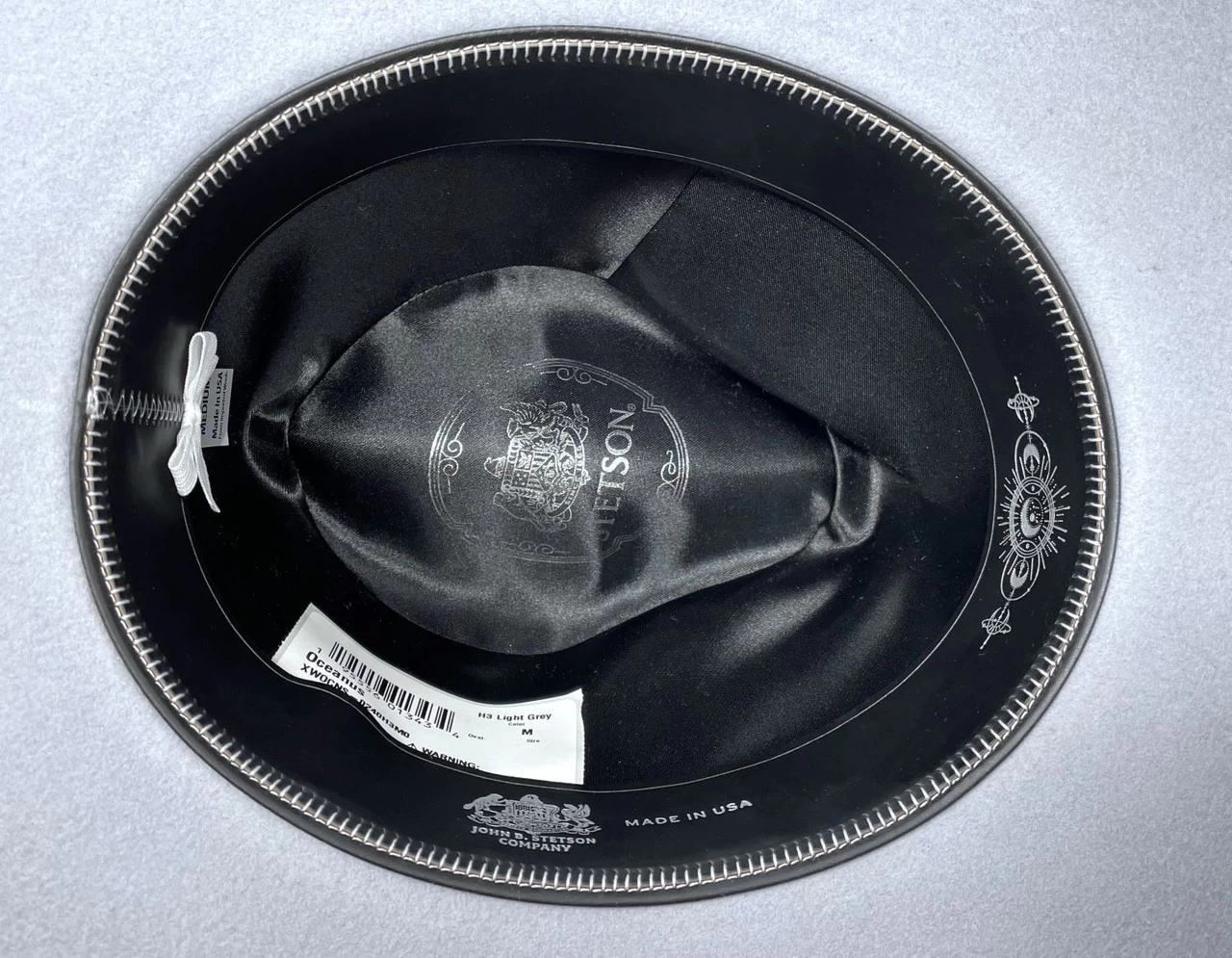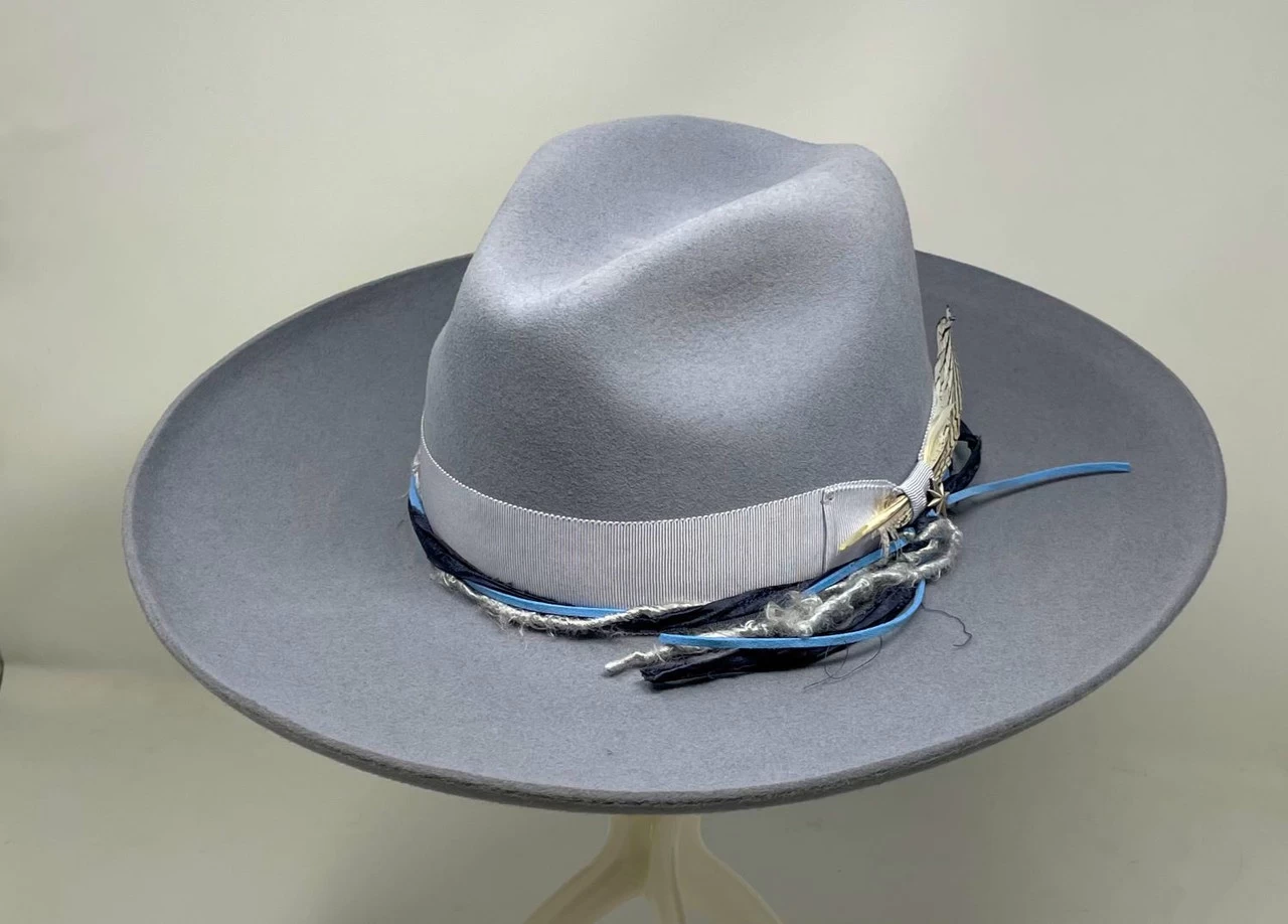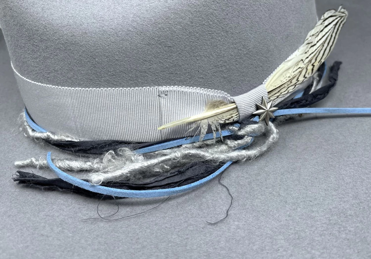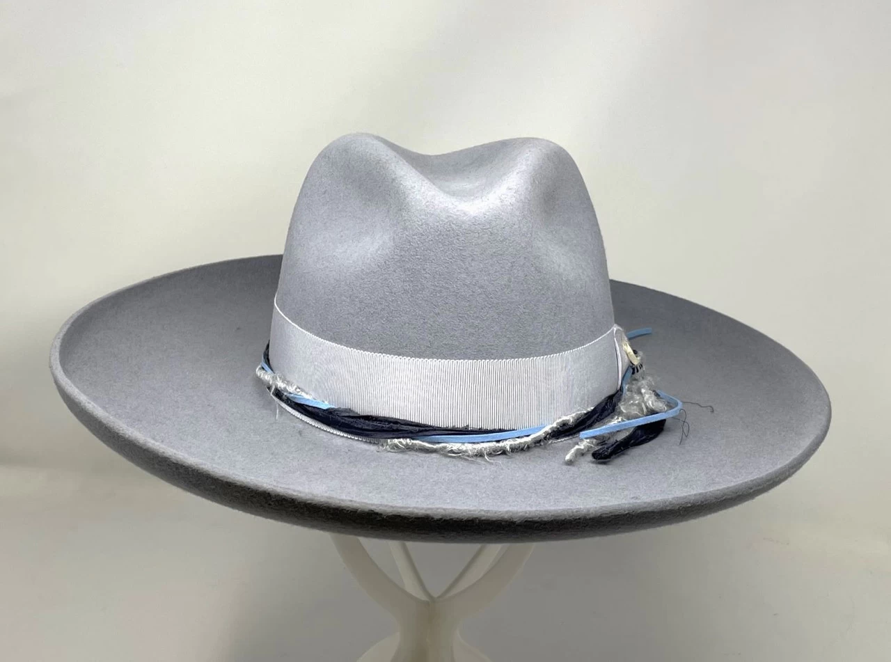 Made in the USA Stetson’s attention drawing Oceanus is from their Seeker Collection. Constructed of light grey wool felt it has a 4 1/2″ pinch front crown and a 4″ raw edge curled brim. Features include a wide grosgrain ribbon band overlaid with a hand dyed silk cord band, starfish pin, full satin lining and a faux leather sweatband.