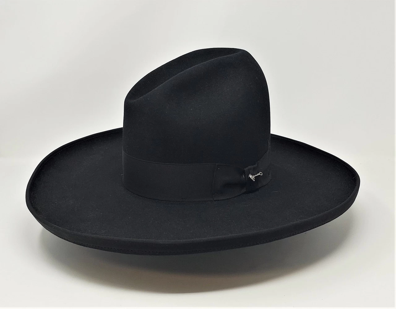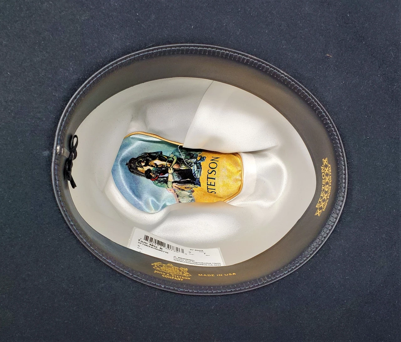 Take a step back in time to the early 20th century in the Tom Mix. Made in the USA of 6X quality fur felt the Tom Mix is from Stetsons Legendary Collection. It has a 5″ bound, pencil rolled brim and a 4 1/2″ (front) and 7″ (approx. back) crown. Features include a wide 1 3/4″ grosgrain ribbon band with bow and Stetson pin, leather sweatband, full satin lining and a Stetson box.