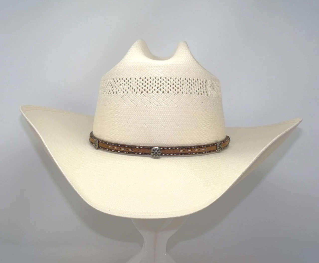 Made in the USA Stetsons Woodburn is constructed of 10X quality Shantung straw. It has a 4 1/8″ cattleman crown with all -around venting, and a 4 1/4″ brim. Features include a brown leather band with silver conchos and center stitch, and a leather sweatband.